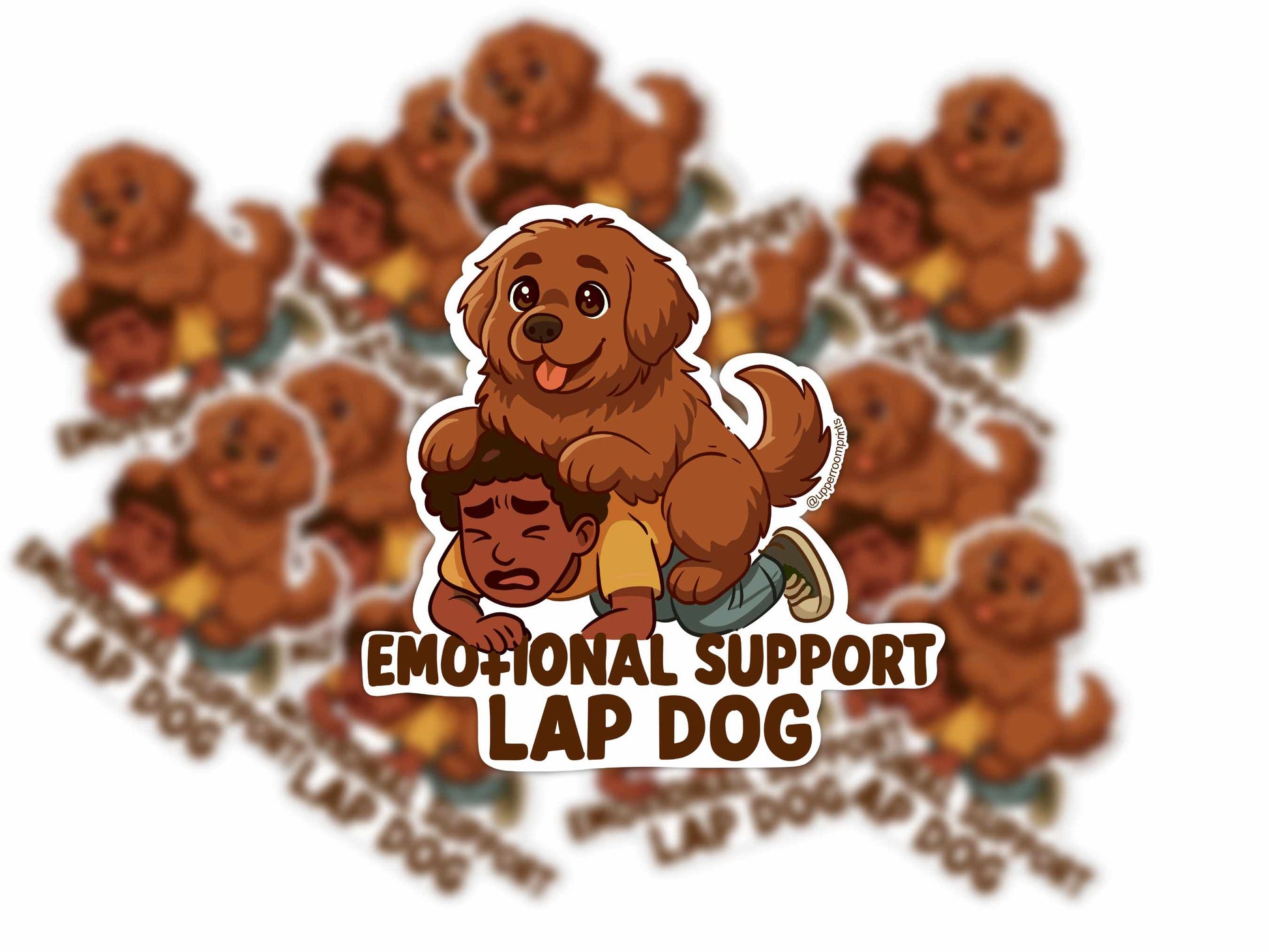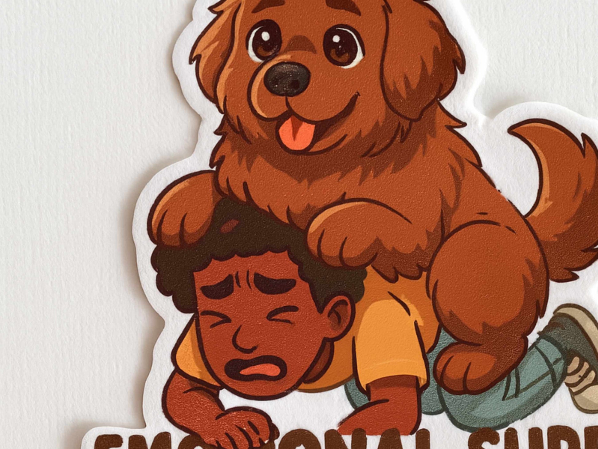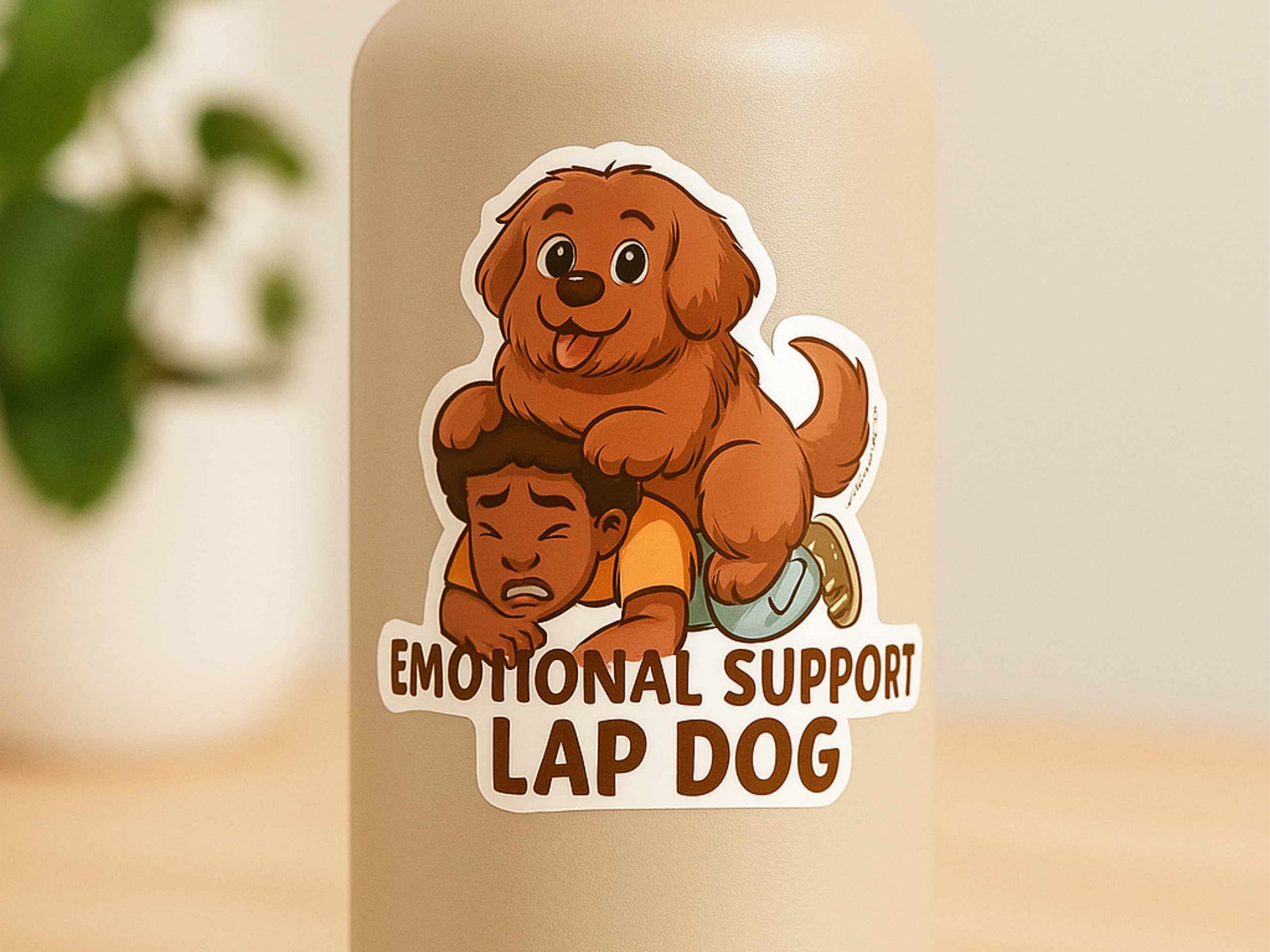 This 3-inch vinyl sticker features a chubby, happy emotional support dog squishing their anxious human companion—because sometimes, the best therapy is 60 lbs of unconditional love on your chest.