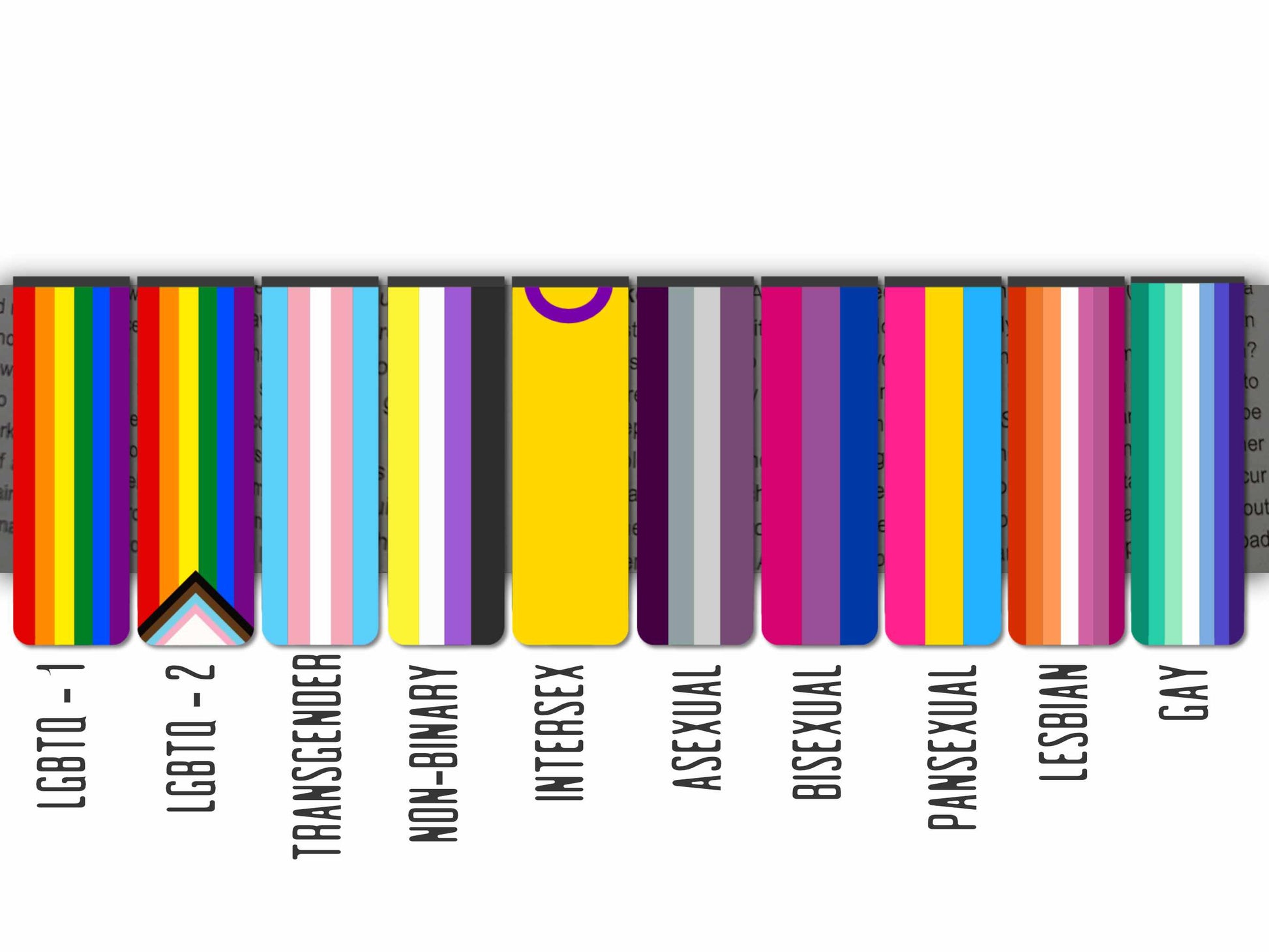 Rainbow, Trans, Lesbian, Bisexual, Pansexual, Asexual, Nonbinary, Aromantic, Genderfluid, Demisexual, and more LGBTQ+ identities represented.
